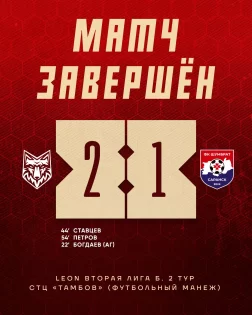 2:1 - с таким счетом завершился матч второго тура Первенства ФНЛ-2 между тамбовским «Спартаком» и саранским «Шумбратом». Поединок с дебютантом лиги для «красно-белых» на был легким. Начало игры осталось за гостями - на 22-й минуте они повели в счете после автогола центрального защитника «Спартака» Марата Богдаева. В концовке первого тайма хозяева отыгрались - на 44-й минуте дебютный гол в стане «волков» забил полузащитник Иван Ставцев.