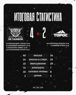 Во втором периоде гости сравняли счёт. Изменить ситуацию тамбовчане смогли лишь в начале третьего – сначала шайбу в ворота «Тороса» отправил Павел Колтыгин, а за 8 секунд до финальной сирены Антон Угольников забил четвёртый, победный гол.