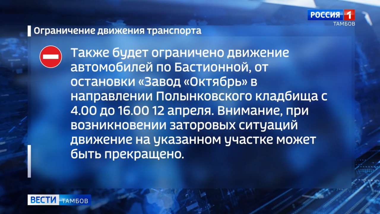 Так, завтра с 18.00 запрещена остановка, а с 22.00 — и движение по улице Степана Разина на участке от Советской до Рассказовского шоссе. Ограничения действуют до 3.00 12 апреля. Остановка запрещена вдоль фасада Храма Новомучеников и исповедников Российских на Бастионной с 18.00 11 апреля до 16.00 12 апреля. С 3.00 до 16.00 12 апреля нельзя будет остановиться на Бастионной от Магистральной до разворотного кольца, на Магистральной — от путепровода до Бастионной, а также на разворотных площадках у Лужковского и Полынковского кладбищ. Движение по Бастионной в сторону Полынковского кладбища будет ограничено с 4.00 до 16.00. При необходимости, в случае заторов, проезд может быть полностью перекрыт. Водителям рекомендуется заранее планировать маршруты и учитывать введённые ограничения.