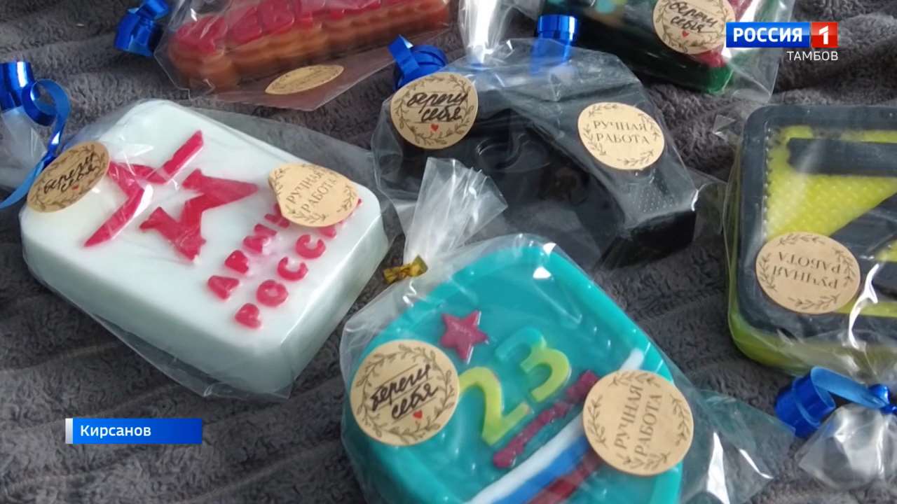 Мы решили сделать в подарок мыло, оно сделано на 23 февраля: флаг России, граната, символизирующая ребят, для которых уже знакомые вещи. Просто подарок, но для них это будет очень приятно, я думаю,