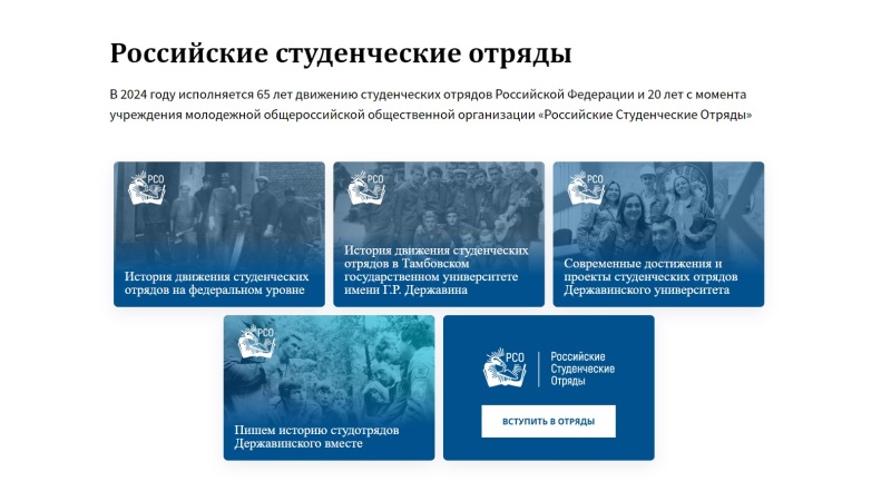 Специалисты Державинского университета создали информационный ресурс об истории студенческих отрядов. Сайт сделали к двум важным юбилеям: 17 февраля исполнилось 65 лет движению студенческих строительных отрядов (ССО) РСО и 20 лет движению Российских студенческих отрядов (РСО).