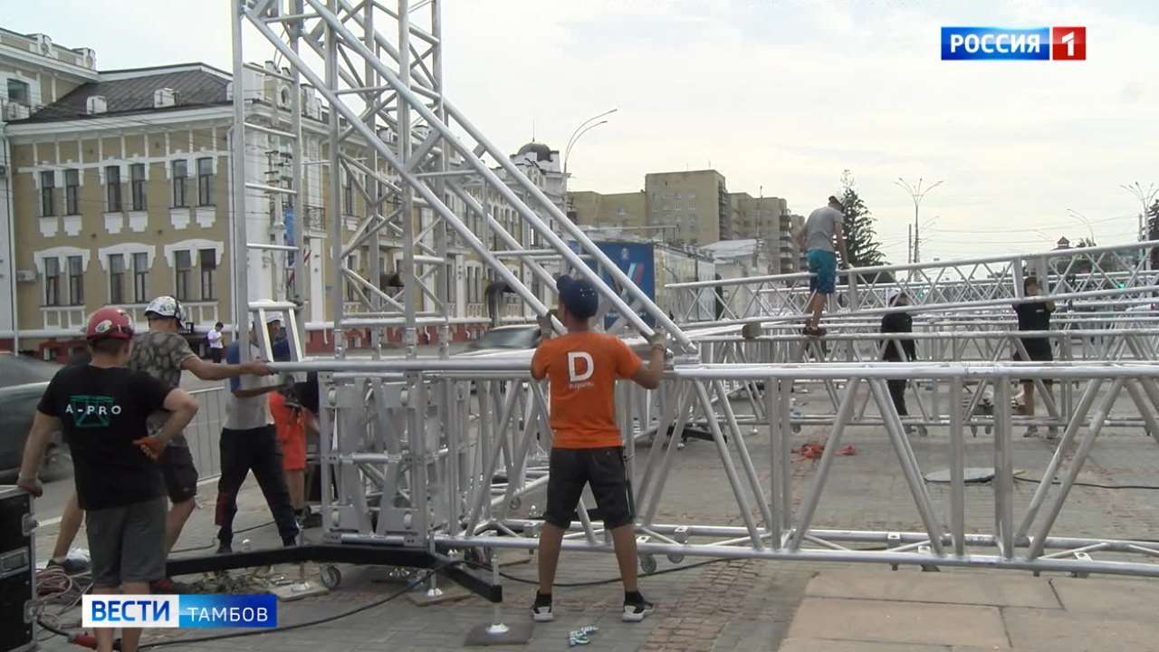 Конструкция сцены в разобранном виде заняла восемь многотонных фур. Одна за другой они прибывают из столицы прямиком в центр Тамбова. Первый этап сборка крыши, площадью в 600 квадратных метров.