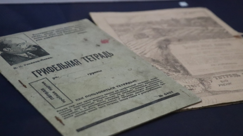 На выставке есть экземпляры дореволюционного периода, середины прошлого века и позднего периода СССР. Например, это аттестат на звание учителя средней школы, выданный в конце 1930-х годов или учебник элементарной геометрии начала прошлого века. Или теллурий — прибор для демонстрации годового движения Земли вокруг Солнца.