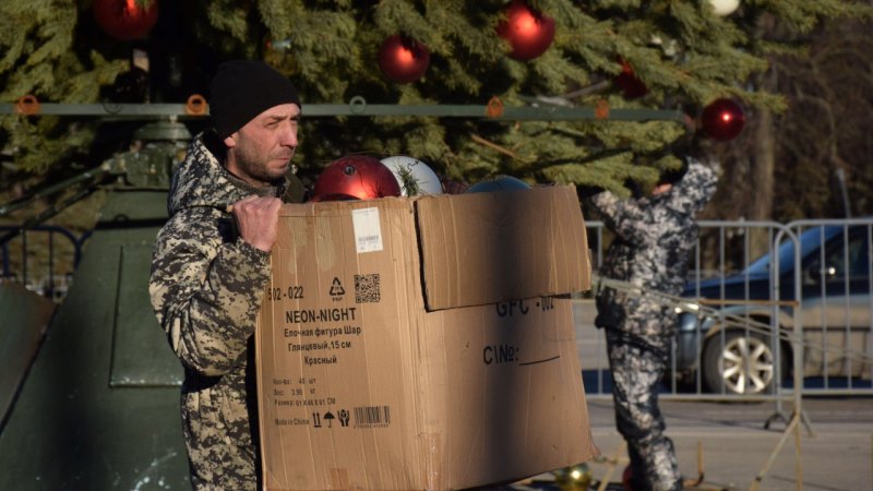 В Тамбове начали разбирать главную городскую ёлку, украшавшую площадь Ленина. Рабочие Дирекции благоустройства и озеленения распределяют игрушки по коробкам и раскручивают каркас конструкции.