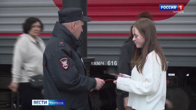 Всероссийская акция «Георгиевская ленточка» в Тамбове получила продолжение на железнодорожном вокзале. Вооружившись символами праздника, сотрудники транспортной полиции встречали пассажиров проходящих поездов.